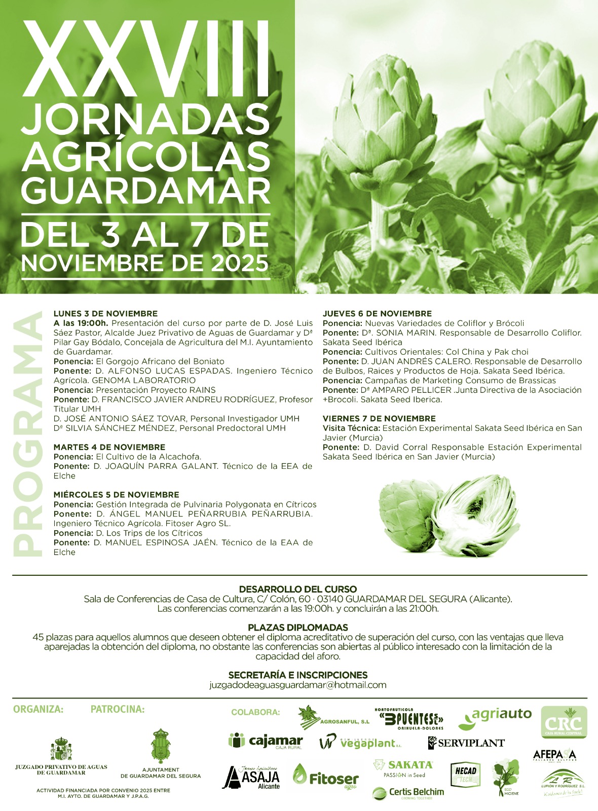 The RAINS project will be represented by UMH at the XXVIII Jornadas Agrícolas Guardamar, taking place from November 3rd to 7th, 2025 in Guardamar del Segura (Alicante). Registration for the event is free of charge but limited to a specific capacity. Interested participants should register in advance by emailing juzgadodeaguasguardamar@hotmail.com.